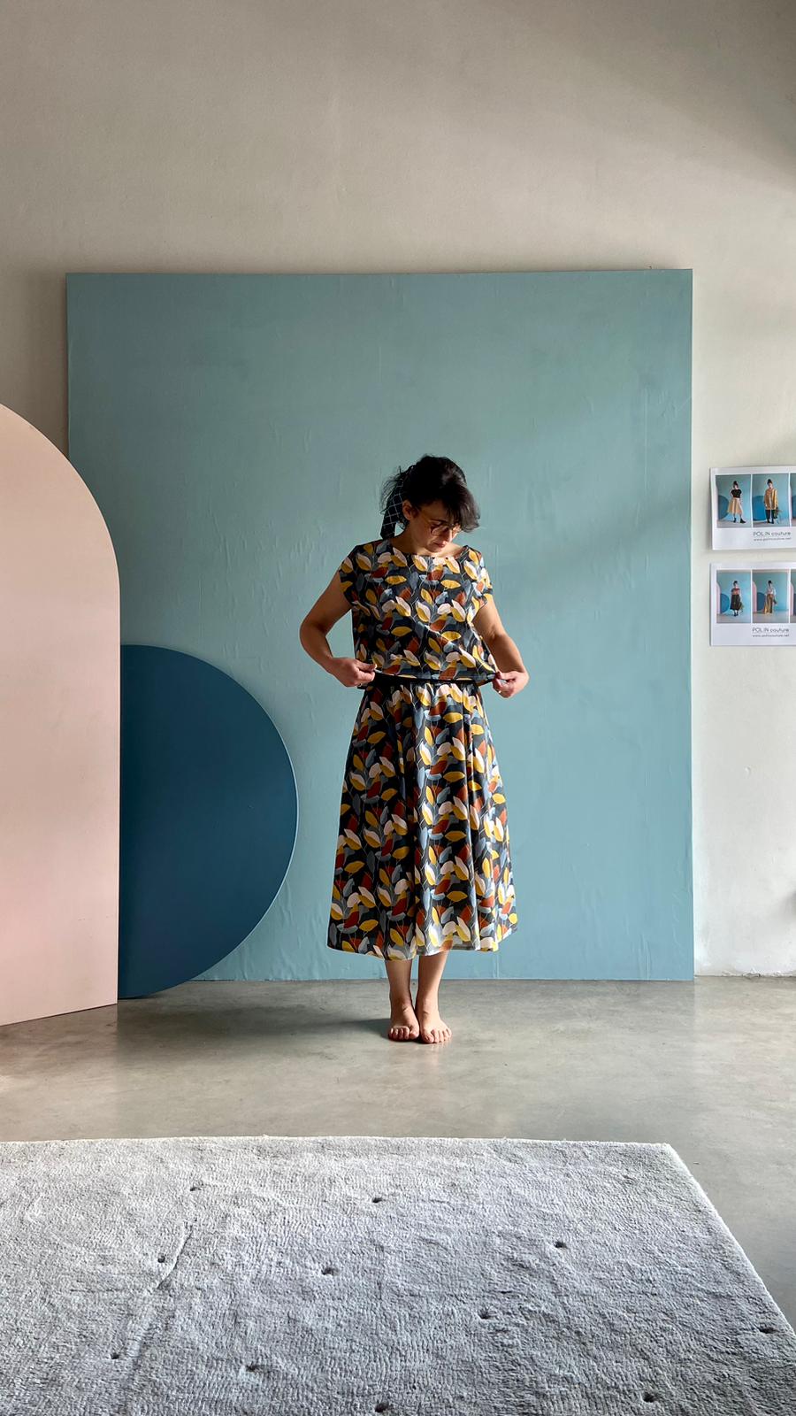 Il pattern Foglie, nelle tonalità del senape, azzurro e mattone disegnato da Sefora Pons per POL.IN, è perfetto per l’estate e per l’autunno.