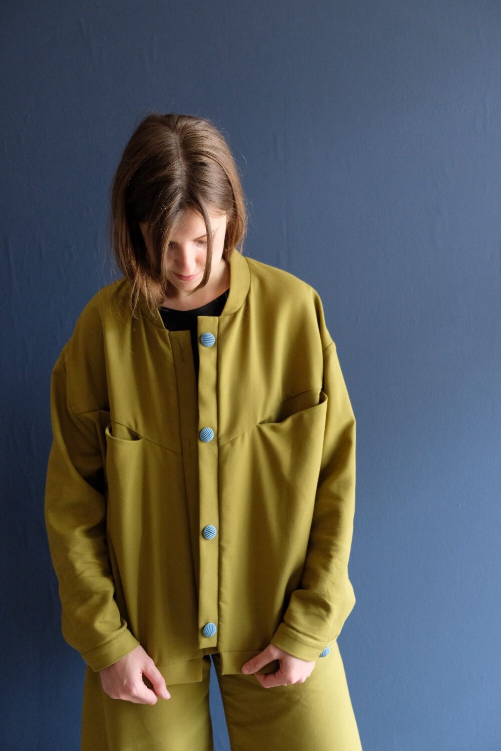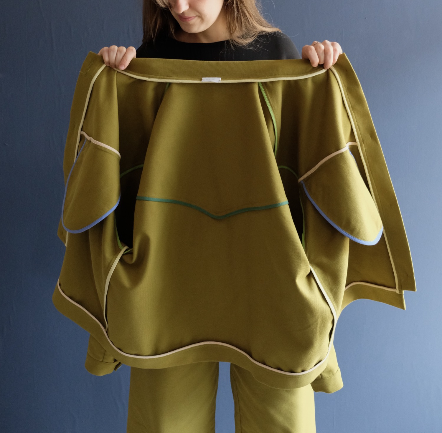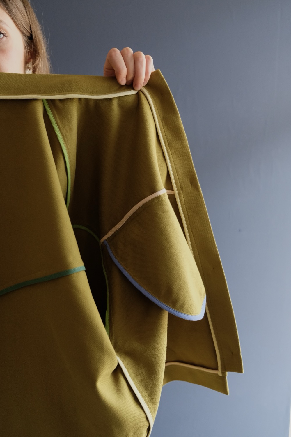 internamente con sbieco di cotone, colori a contrasto. Tasche nascoste nei tagli