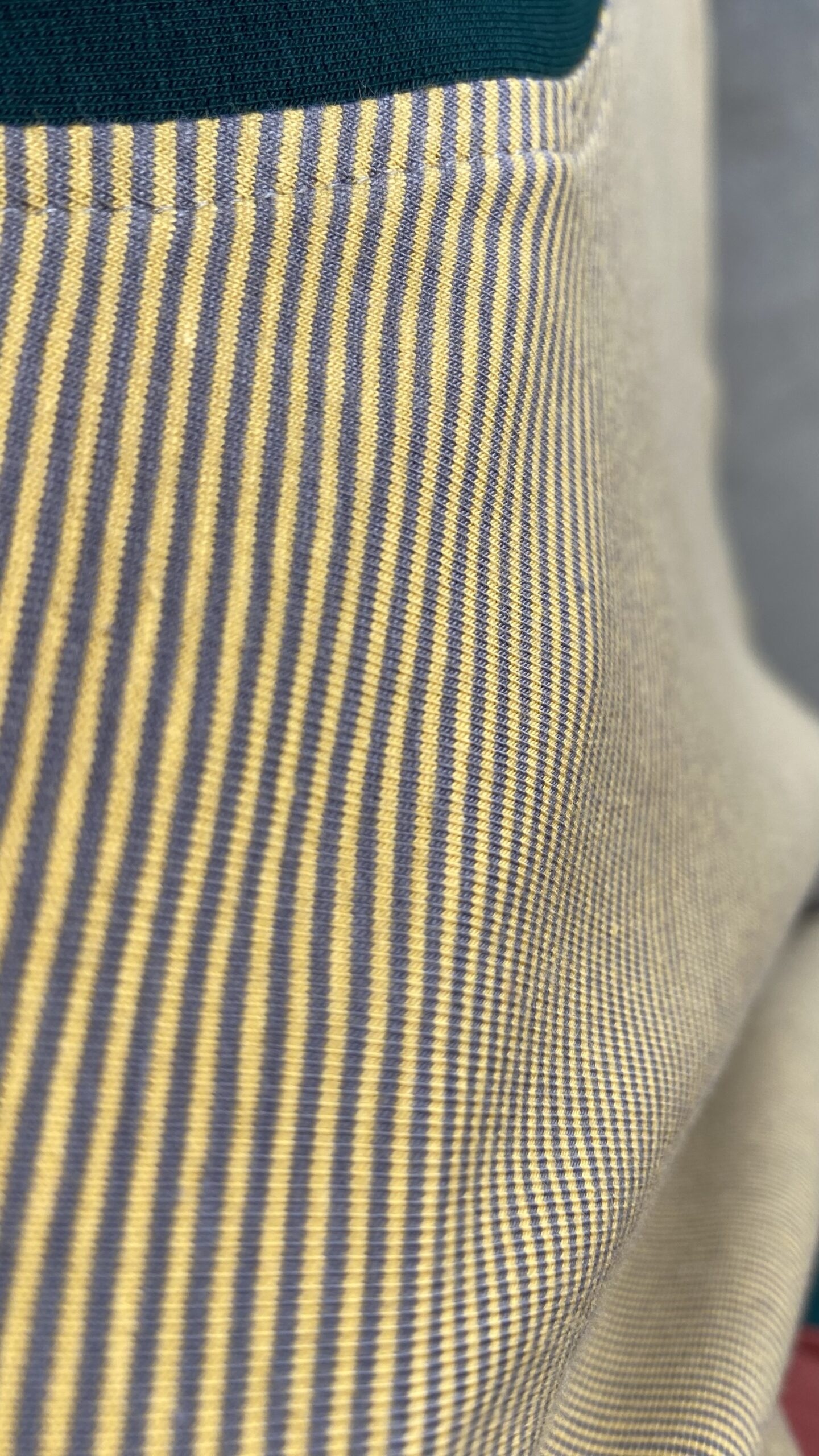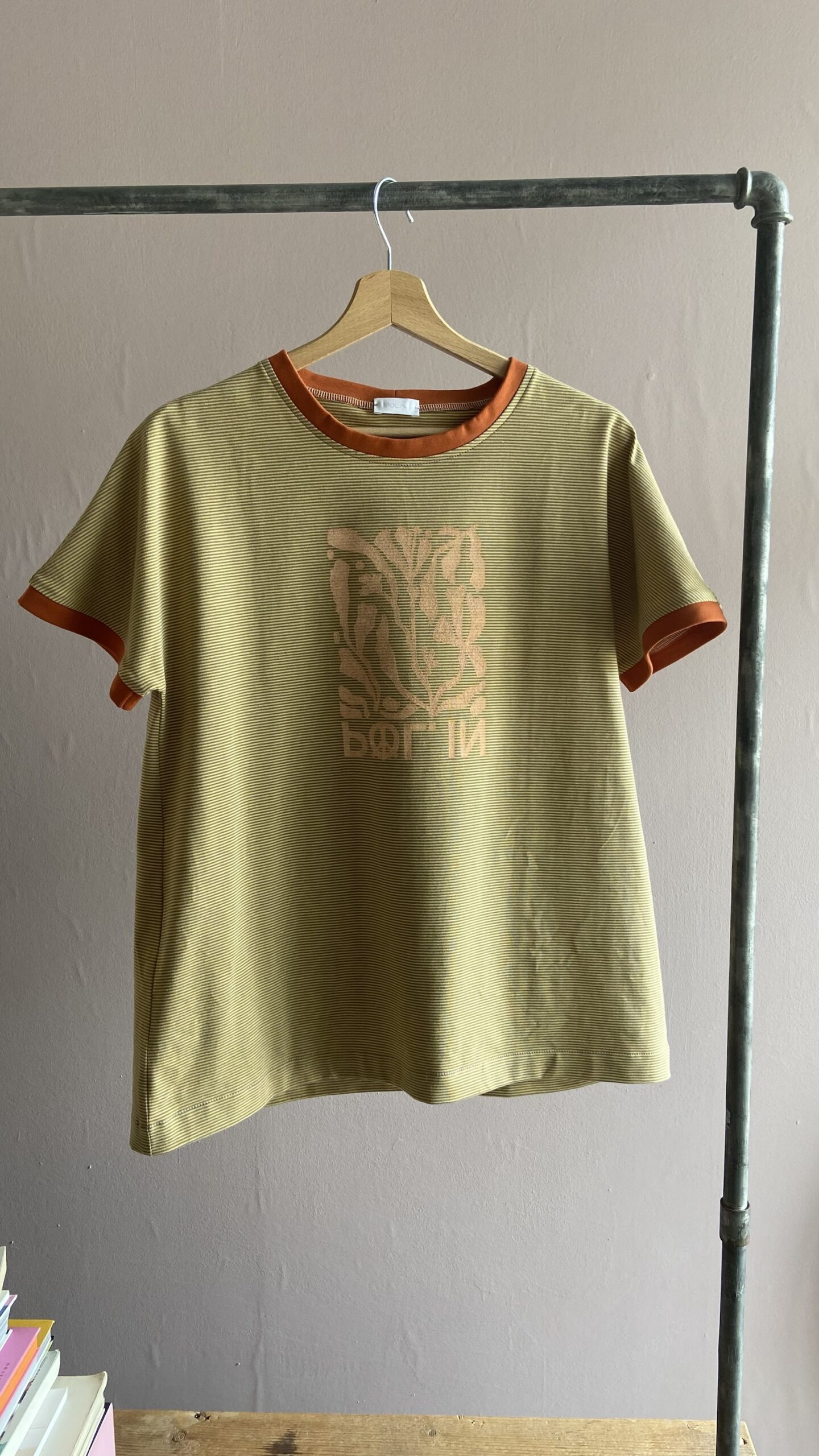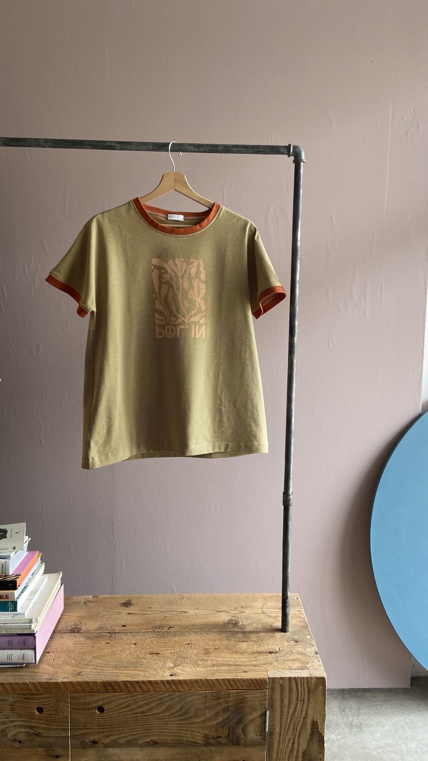 Pilosella t-shirt con stampa, 97%cotone e 3% elastan, micro righe in giallo/grigio, collo e bordi arancione scuro a contrasto.