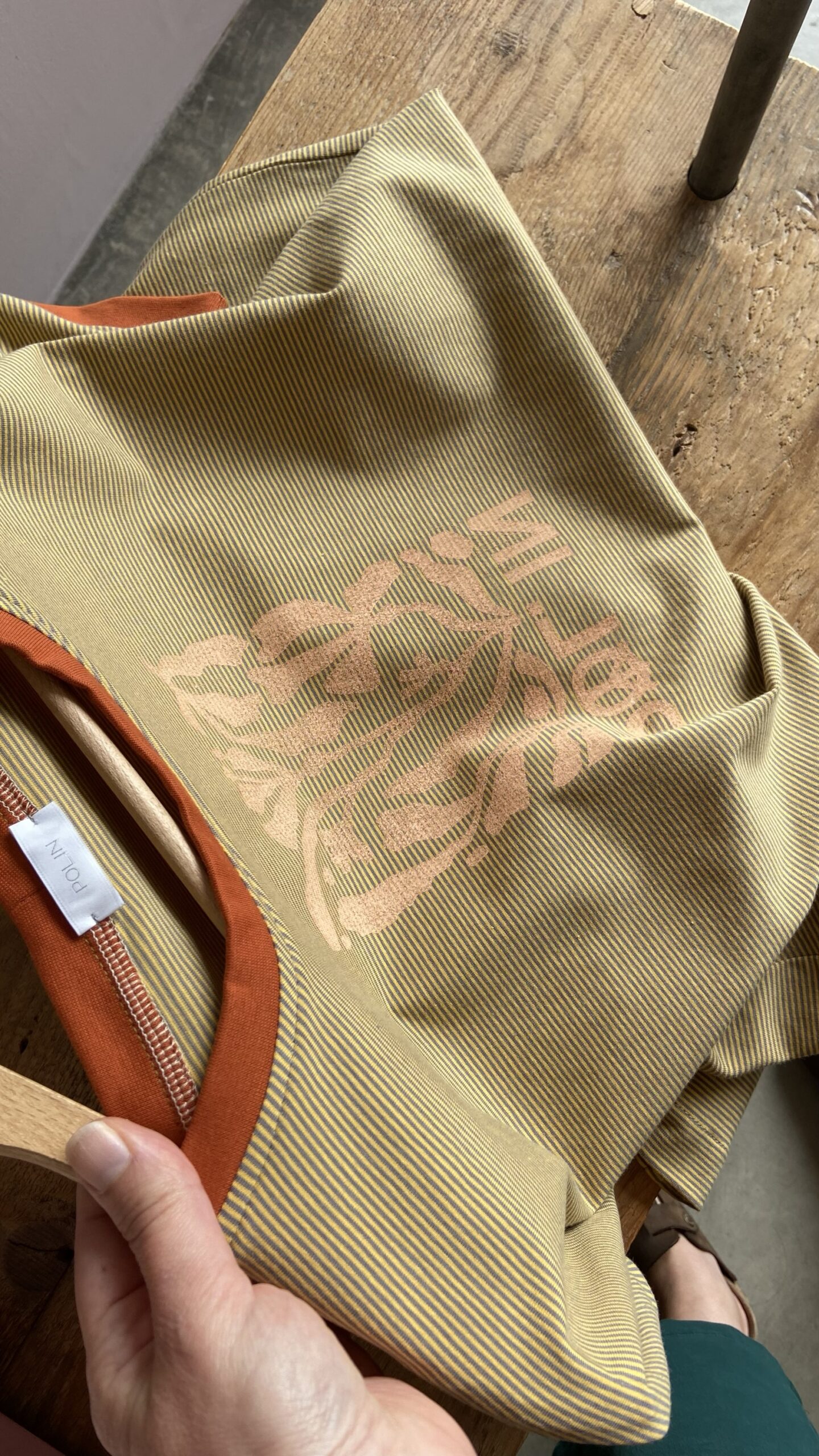 La stampa sul davanti riproduce una fantasia a fiori con la scritta POL.IN , porta con sé un messaggio di pace e sostenibilità. Disegnata e intagliata a mano, è stampata manualmente con la tecnica del blockprinting con colori a base acqua.