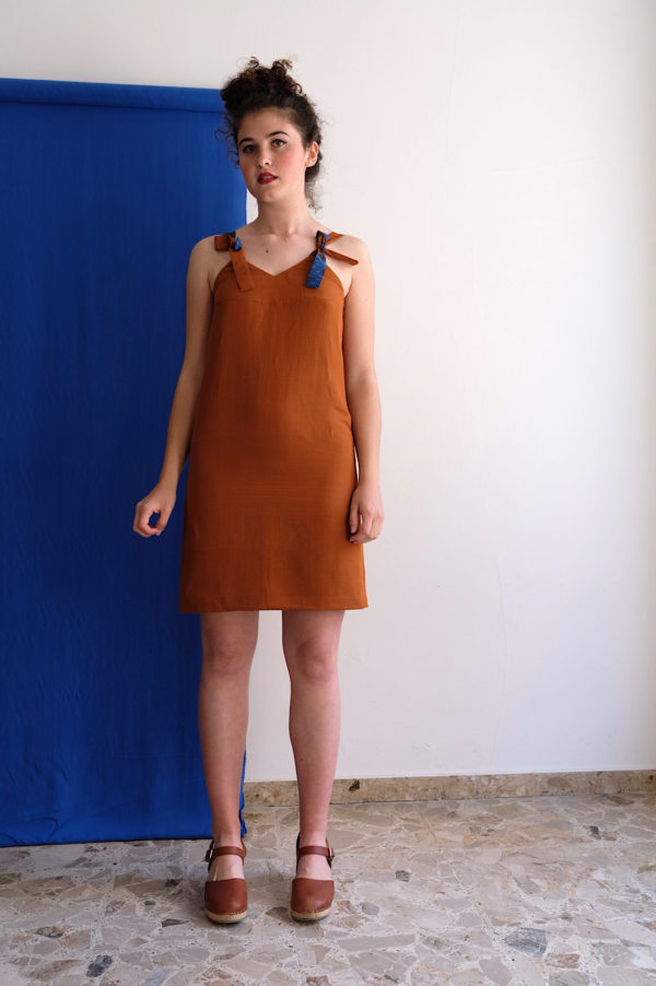Abitino corto e dritto color mattone in lino e viscosa.