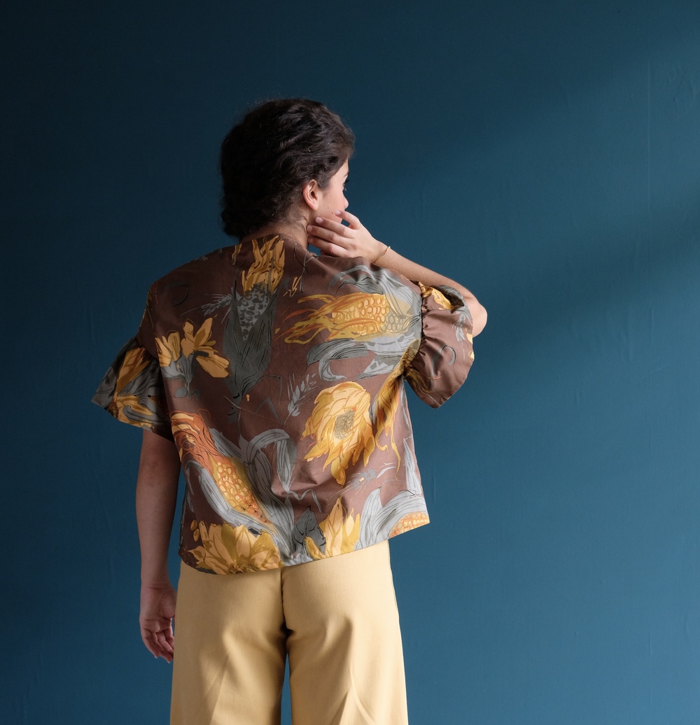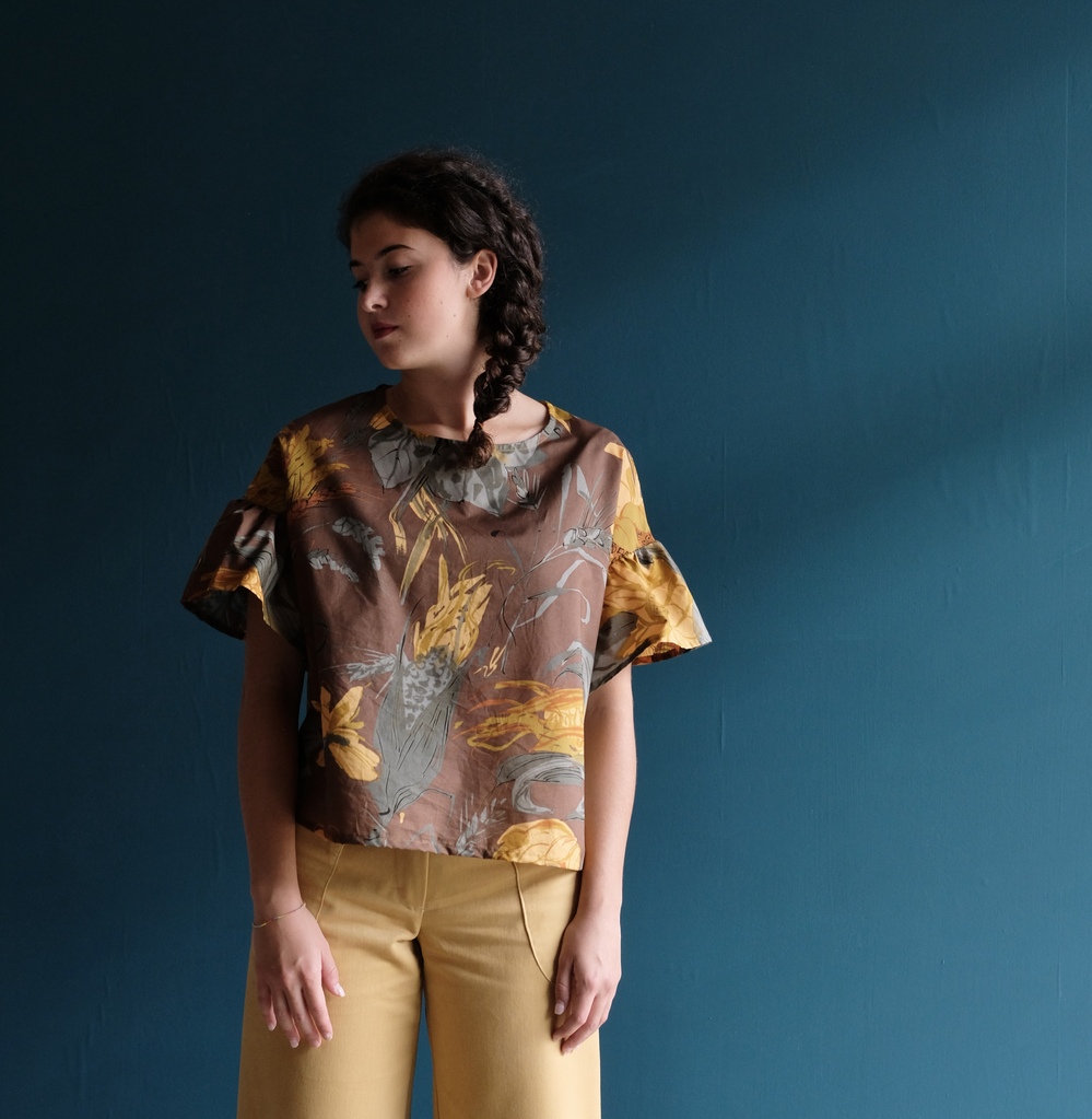 Top in cotone leggero modello base kimono con manichette arricciate.
