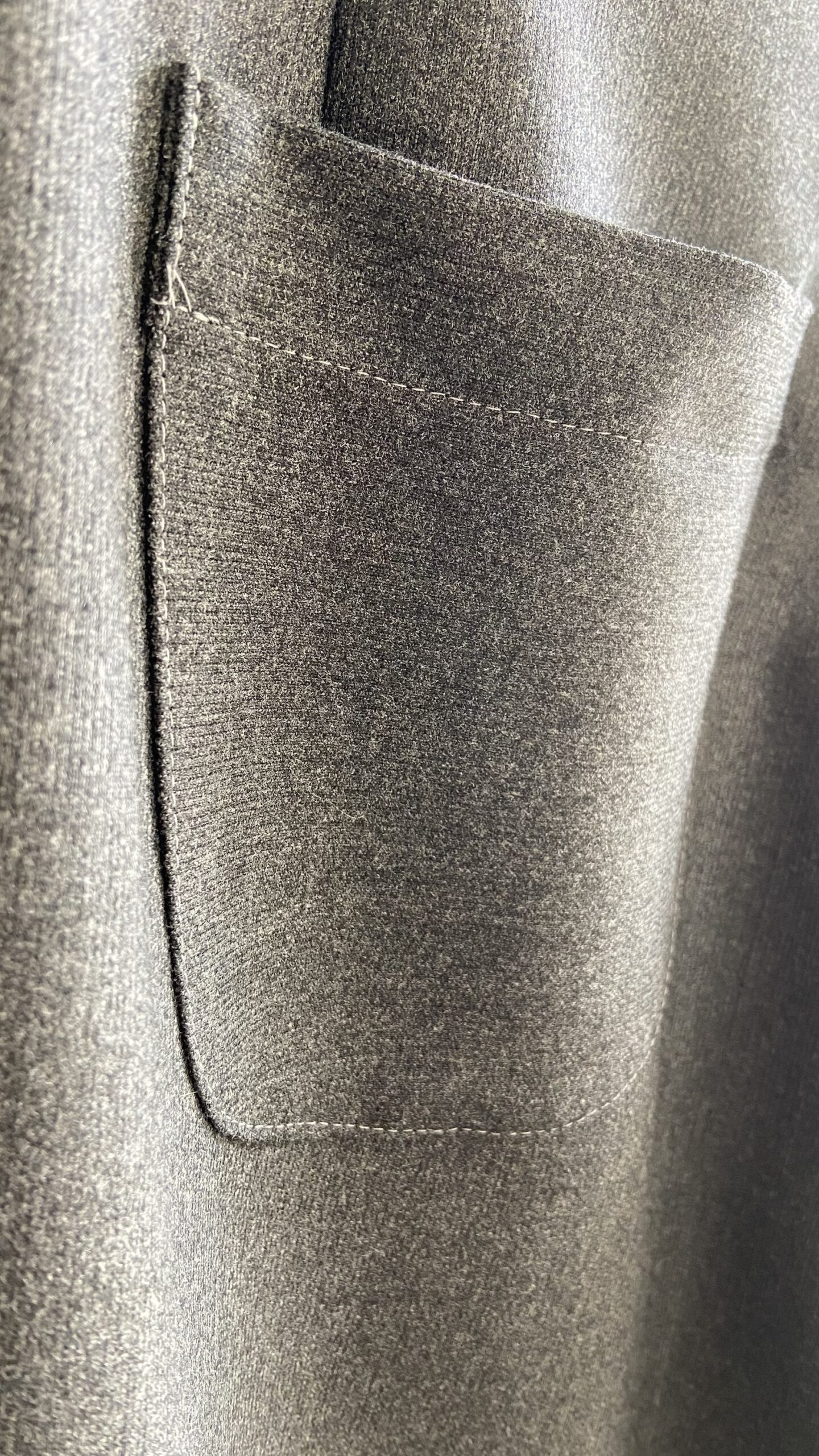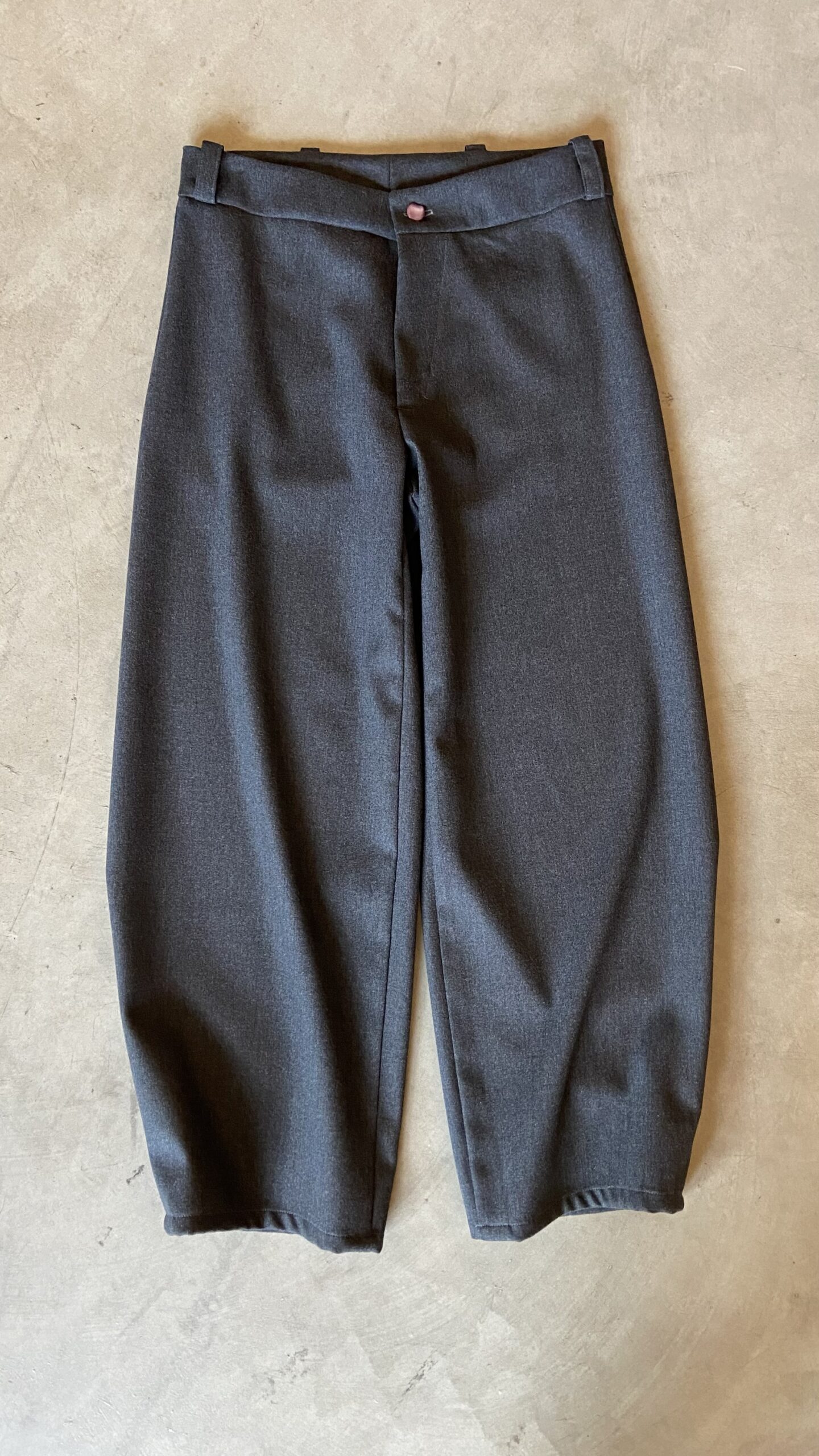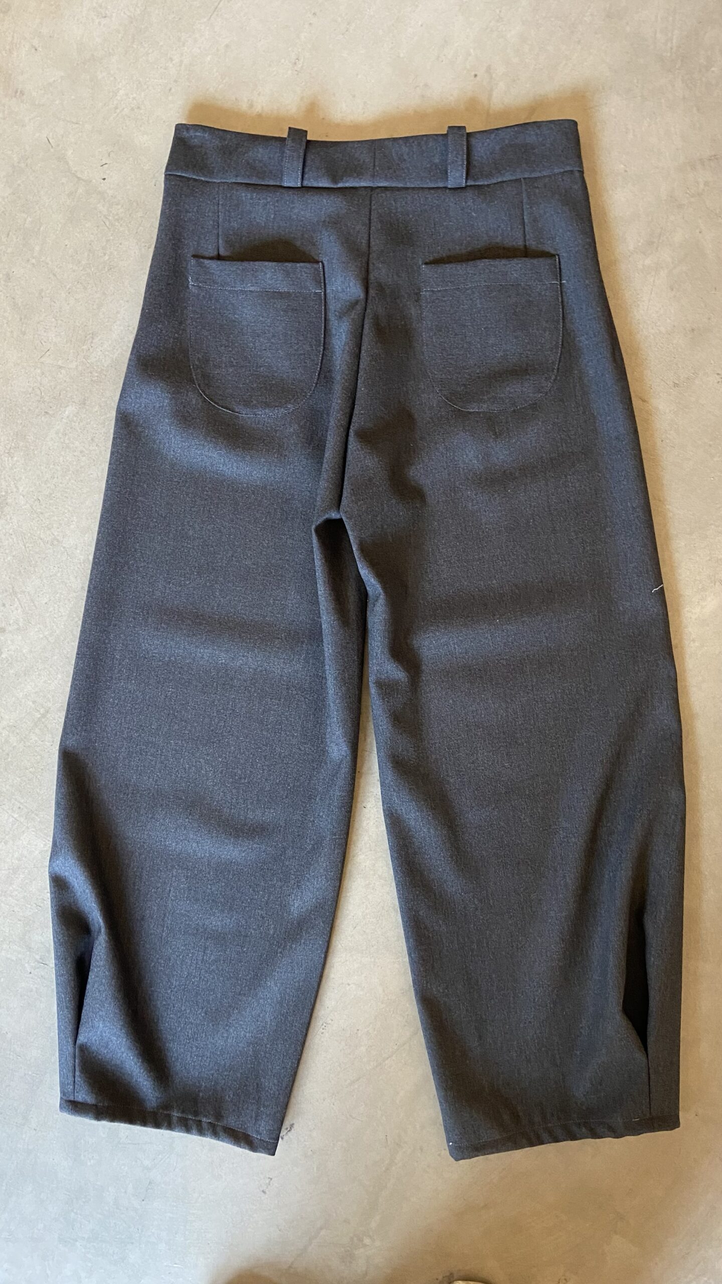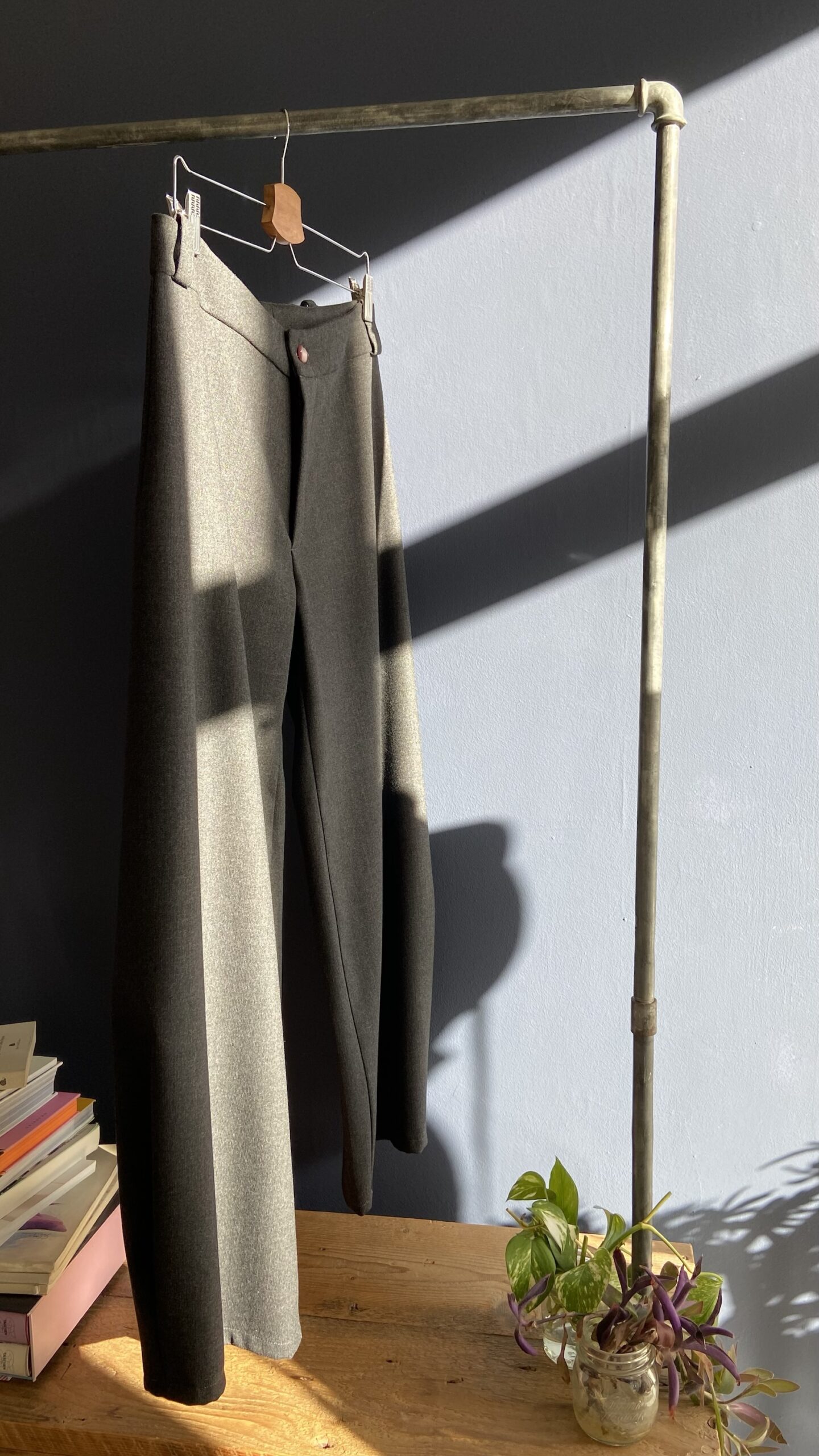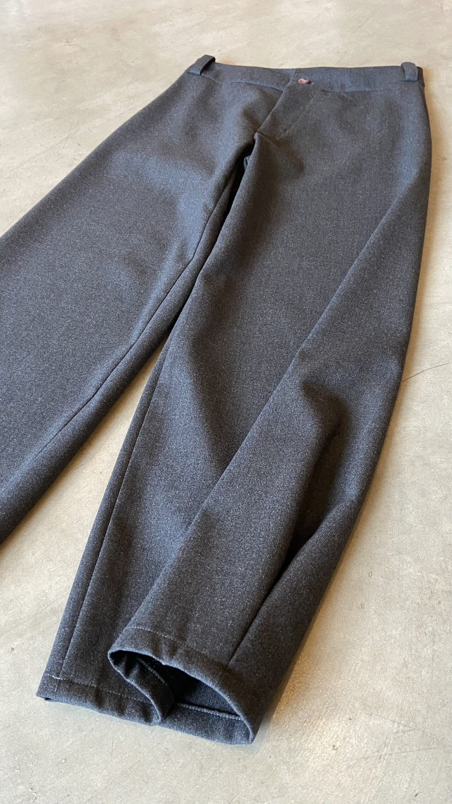Pantalone in lana 100%, grigio scuro. Tessuto vintage. Patta sul davanti con zip. Tasche a toppa arrotondate sul dietro. Cinturino adattato a seguire bene le forme del punto vita .Piegona sul fondo a chiudere verso la caviglia. Modello iconico POL.IN.